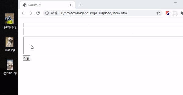 drop하였을때는 파일을 내려놨을때 드래그앤드롭의 동작 중 가지고 있던 데이터의 정보를 확인하기 위해 dataTransfer 파일 정보를 가져옵니다.