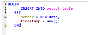 input_table 테이블에 INSERT동작이 발생하면 data컬럼의 값을 가져와 output_table에 넣어주는 INSERT -> INSERT 트리거를 생성했습니다.