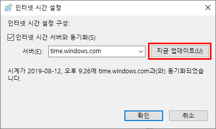 3. 지금 업데이트를 누르고 시간을 동기화 시킨다. (원하는 서버가 있다면 해당 서버 주소를 입력한다.)