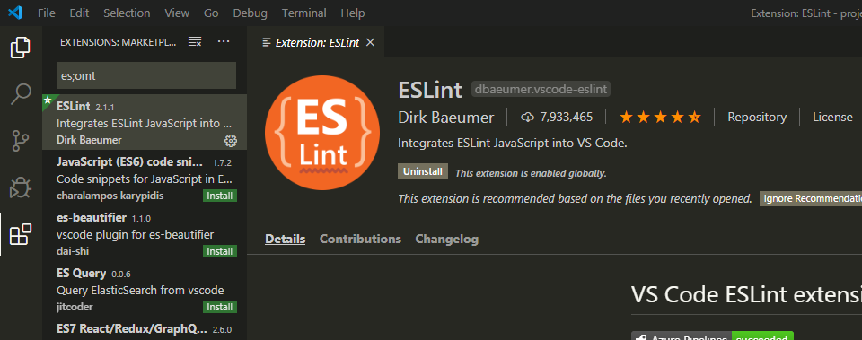 ESLint를 검색하고 설치하면 된다.