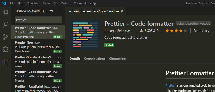 Prettier도 마찬가지로 검색하면 바로 나오므로 설치해서 사용하면 된다.