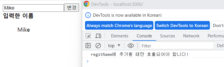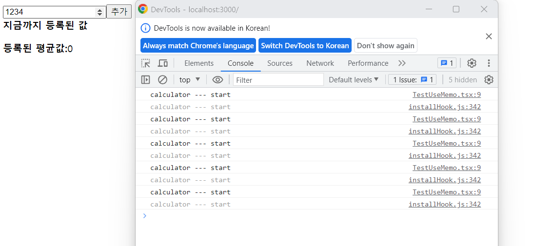 이제 초기 렌더링될 때 한번 호출되고 input에 입력해보면 전혀 부하가 발생하지 않는 걸 볼 수 있다. 숫자를 입력하고 추가버튼을 누르면 그때 콜백함수가 호출되면서 calculaotr가 호출된다.