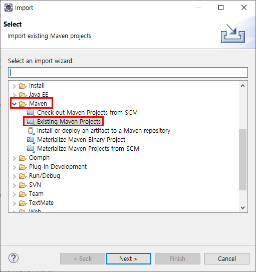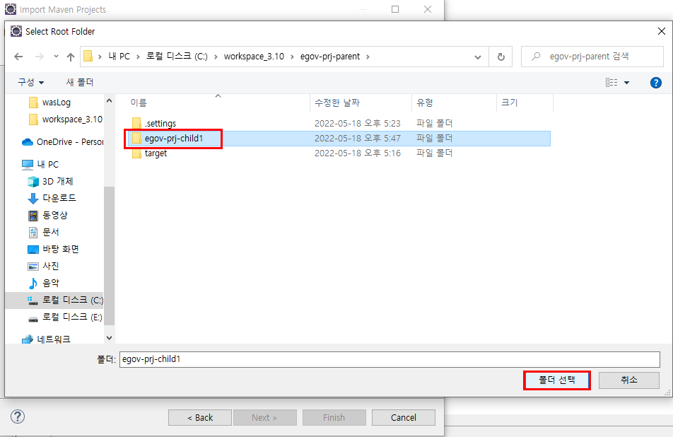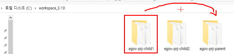 3. 해당 워크스페이스가 동작하고 있는 경로로가서 child1프로젝트를 parent프로젝트로 넣습니다.