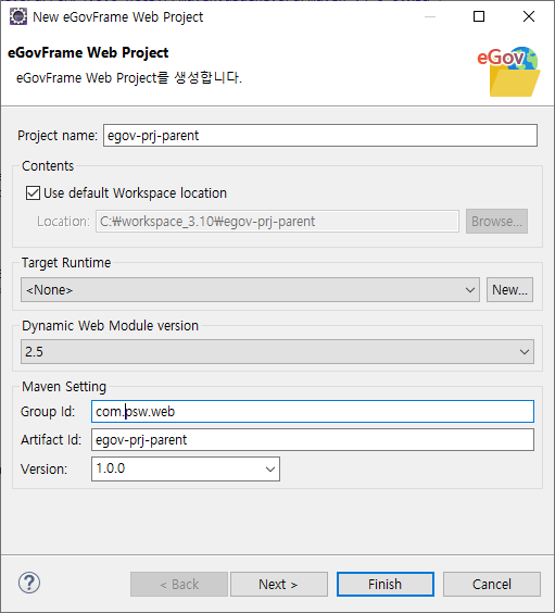 2. egov 프로젝트를 생성하고 pom.xml을 바로 수정합니다.